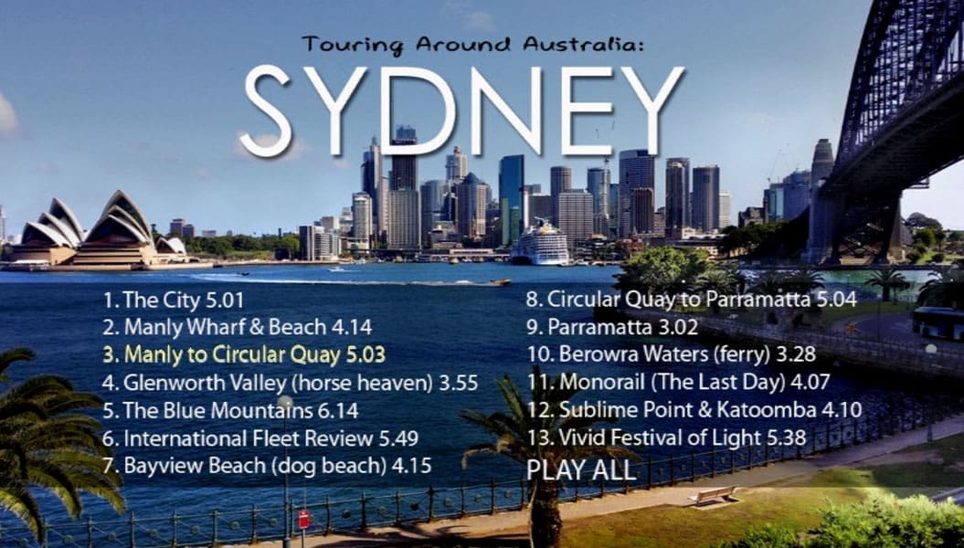 Video footage of Sydney and its surrounds is accompanied by relaxing musical orchestrations, featuring strings, pianos and woodwind. No talking, just beautiful music.