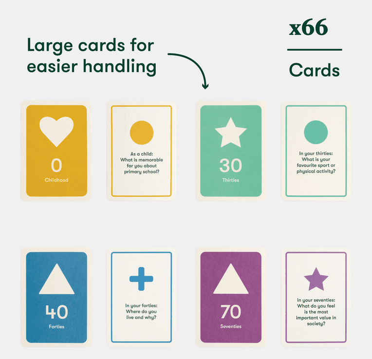 A first of its kind, our brand-new life-storytelling board game uses conversation as a way of exploring your life from childhood through the present and into the future. It invites you to think and talk about who you are, your experiences, feelings and values and what you have done and want to do, supporting those all-important feelings of identity, independence and sense of purpose, while building closer relationships.