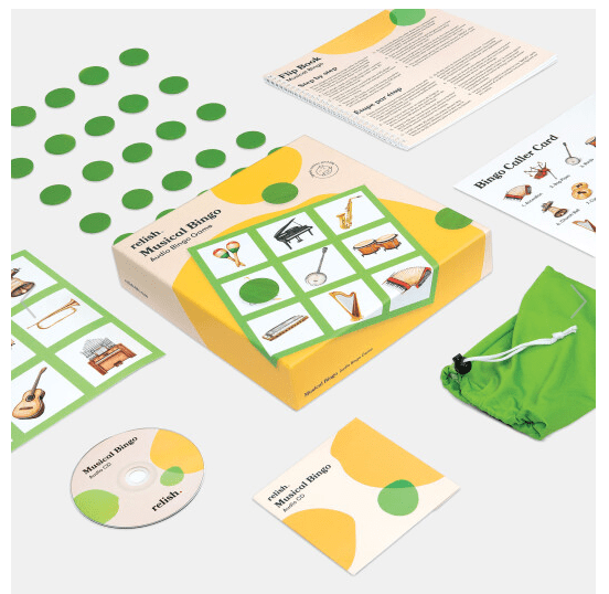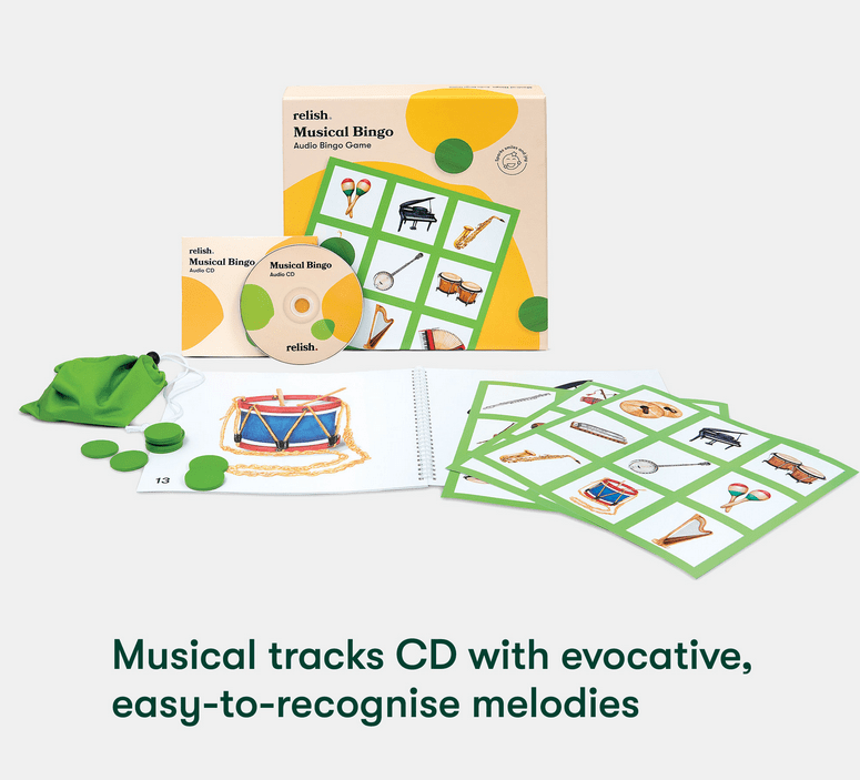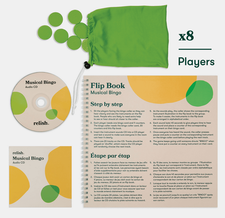 Musical Bingo Ideal for groups of up to 8 players, this game features a musical twist on the classic bingo. Gather round, family and friends, for a healthy burst of fun competition and shared joy. Simply listen to the recognisable pieces of music and match up with the instruments on your card before shouting that winning word ‘Bingo’.