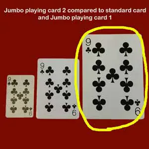 Jumbo playing cards are 9.5cm w x 14.5m hand thus highly visible and easy to manipulate. Some people may need to use card holder. Click on pictures to see size comparison to regular playing cards and Jumbo Playing Cards 1.