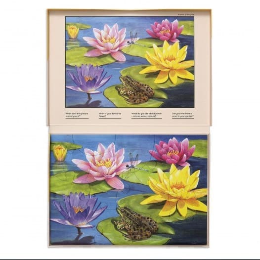 This 13p large piece jigsaw puzzle – Lily Pond, is suitable for the person in the middle stages of their dementia journey, with an image that is a tool to share memories and provide a sense of achievement. The image is age appropriate, enabling engagement of the person with dementia without being childish or patronising.