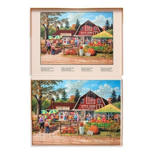 This 63p large piece jigsaw puzzle -Farmer’s Market is suitable for the person in the early stage of their dementia journey, with an image that is a tool to share memories and provide a sense of achievement. The image is age appropriate, enabling engagement of the person with dementia without being childish or patronising.