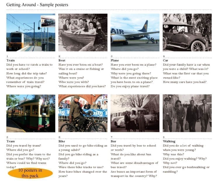A set of 10 A3 posters depicting historical and everyday forms of transport, this reminiscence kit for seniors supports conversation and memory recall in one-to-one and group sessions. Subject matter is relevant for Australian audiences and suitable for people living with dementia.