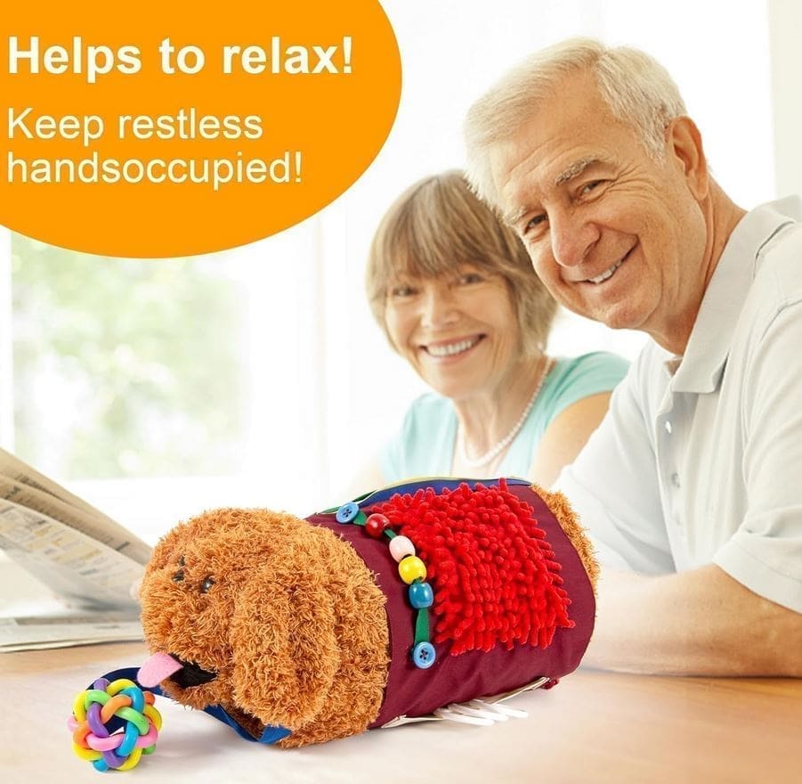 The Activity Hand Twiddle – Dog is a soft fabric muff with a range of detachable tactile attachments. As a twiddle toy for seniors, it gives restless or fidgety hands something purposeful to explore during quiet or one-to-one time.