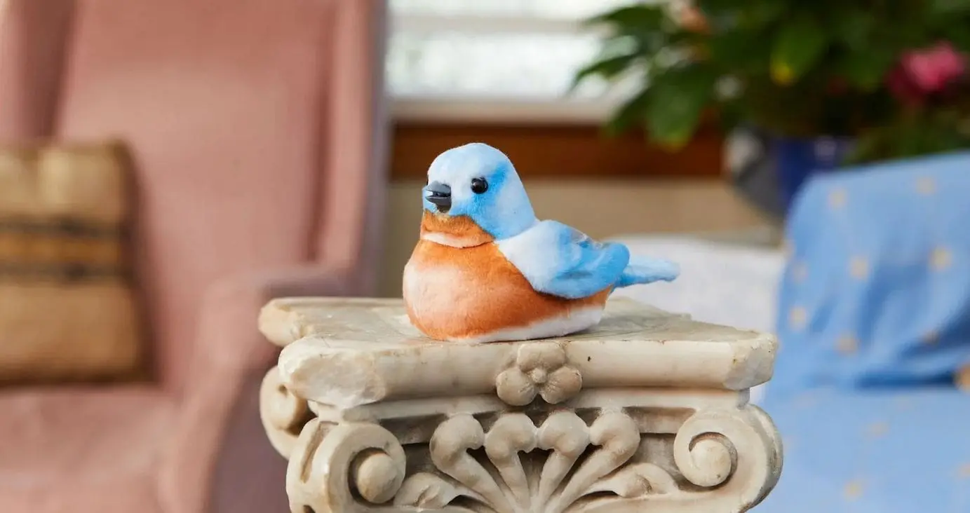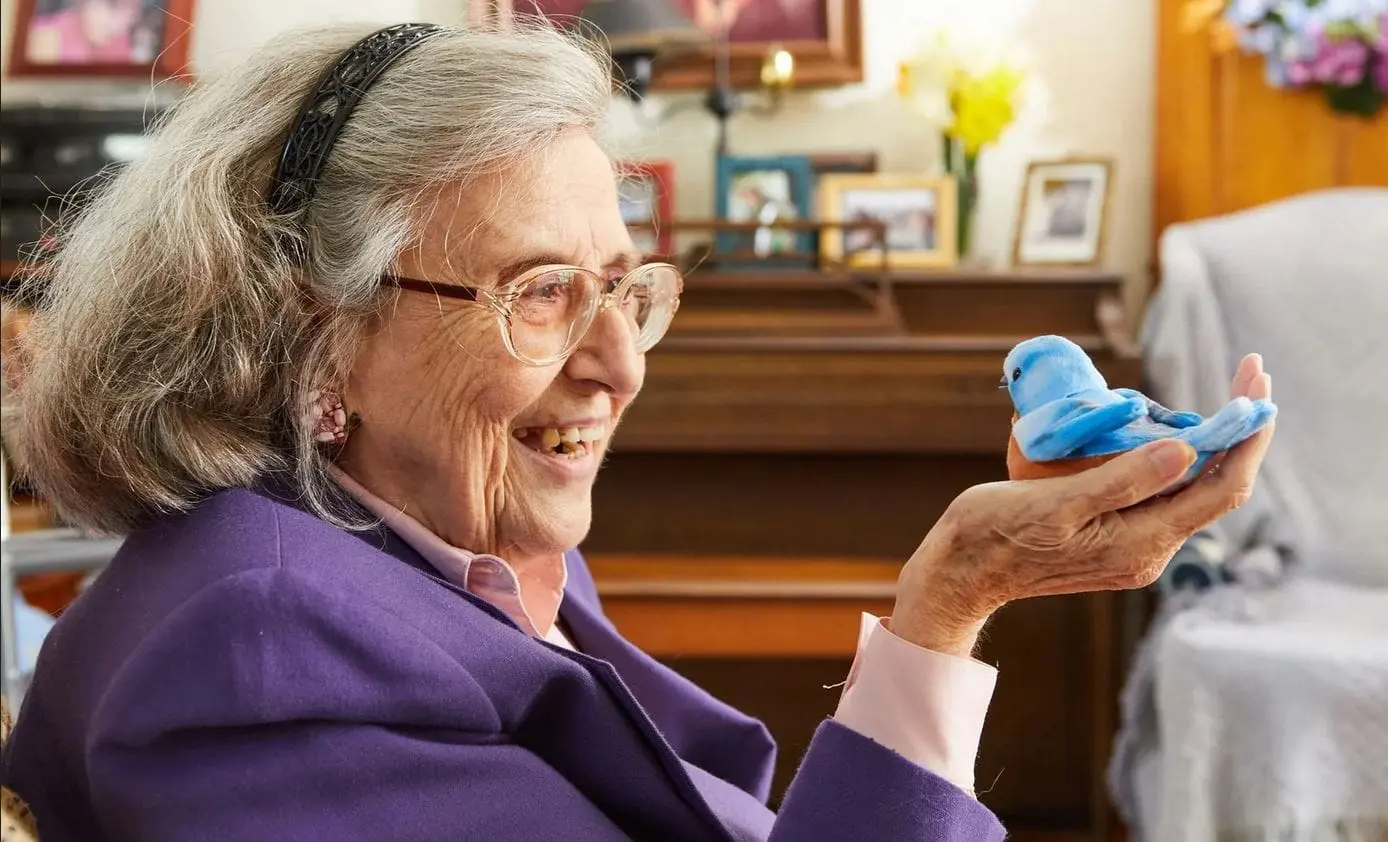 These cheerful animatronic birds joyfully sing to older adults and their family, friends, and caregivers.